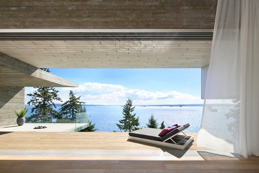 Выбранная ими натуральная минималистская палитра материалов — сырого бетона, стали, кожи и дерева — создаёт спокойное внутреннее пространство, которое не отвлекает внимание от океанского вида, расстилающегося снаружи.