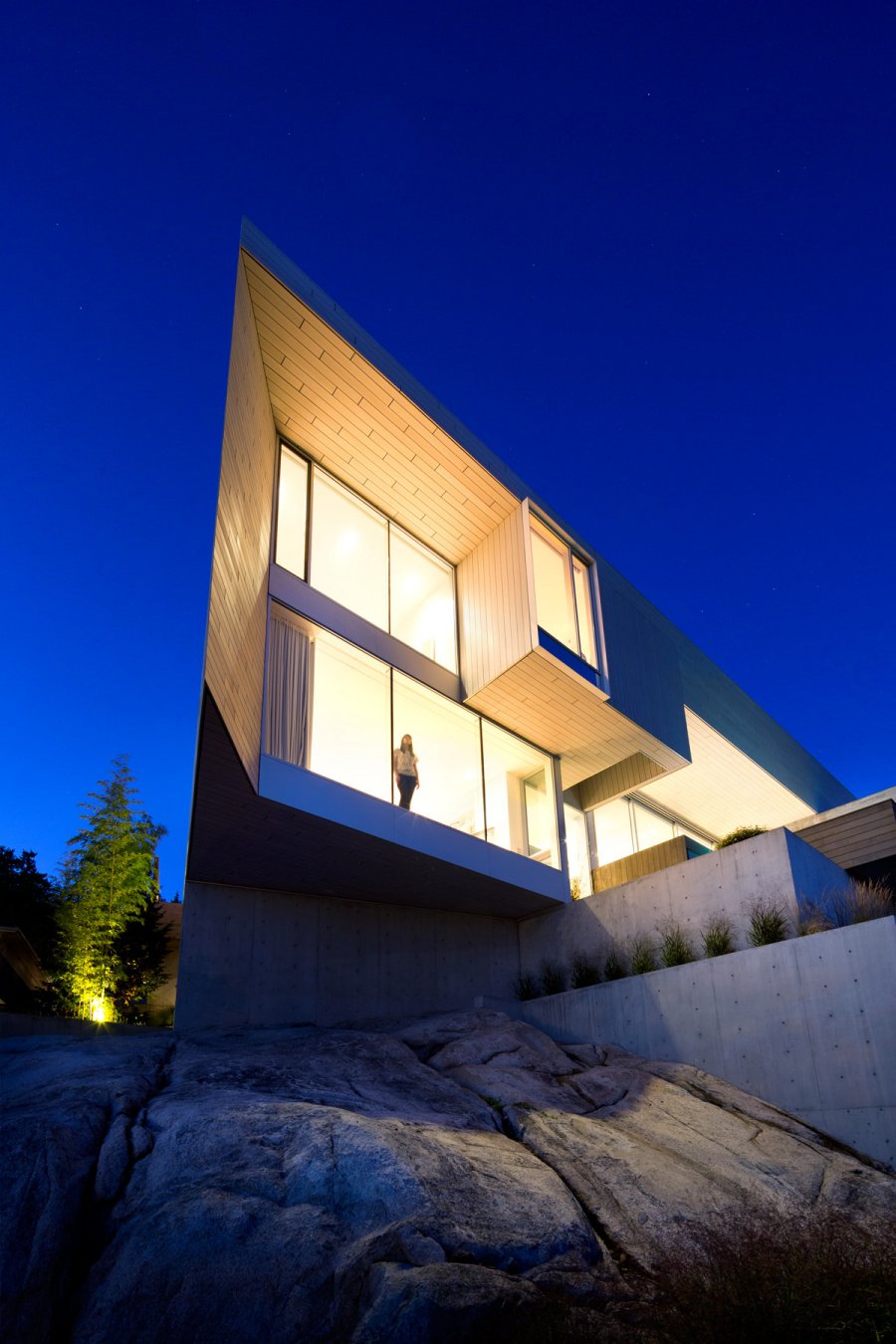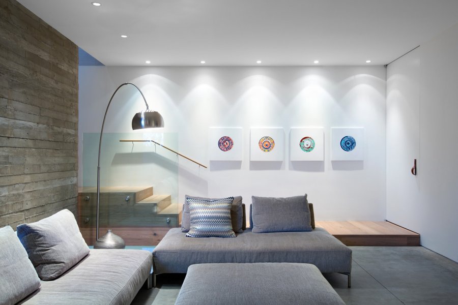 Движение тщательно срежиссировано, чтобы замаскировать значительное изменение высоты по мере перемещения внутри дома. Ни одна лестница не поднимается более, чем на пол-этажа, позволяя свободно просматривать всё пространство, начиная от огромной входной двери и до открывающейся к морю террасы. Точно так же организация сдвигов уровней допускает щедрые объёмы в главной гостиной и более уютные помещения для спален. Благодаря своей бетонной конструкции, дом обладает характером, напоминающим пещеру — с тщательно вырезанными пространствами, в которых возникает ощущение интимности.