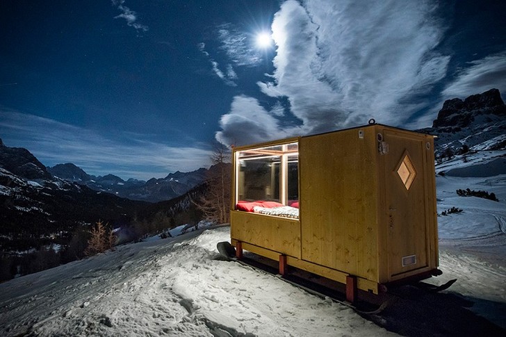 Среди живописных Доломитовых Альп на высоте 2055 метров над уровнем моря появился необычный вагончик на санках. Это новый аттракцион для романтиков, решивших полюбоваться звездным небом. Воспользовавшись крошечной кабинкой, можно провести ночь на природе в довольно комфортных условиях.