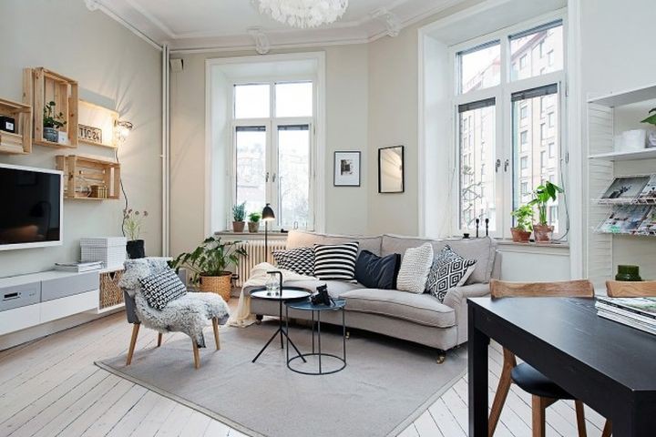 Гостиная в светлых, холодных цветах кажется намного больше, и нам это уже нравится. Плюс обаяния добавляют меховые накидки и самодельные деревянные полки. Что бы посмотреть телевизор компанией, правда, придется двигать диван. Но и это не плохо: такая комната ставит живое общение превыше телевизора.