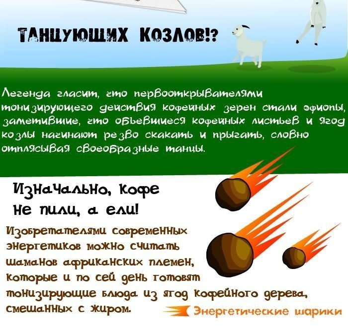 Легенда гласит, что первооткрывателями тонизирующего действие кофейных зерен стали эфиопы, заметившие, что объевшиеся кофейных листьев и ягод козлы начинают резво скакать и прыгать, словно отплясывая своеобразные танцы.