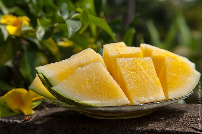 Первый раз мы попробовали желтый арбуз в Малайзии и он оказался не очень сладким, а на Бали покупаем их часто и всегда попадаются сладкие. Однажды купили для сравнения вкусов и красный, и желтый, так вот красный оказался менее сладким, даже показался водянистым, хотя если есть его отдельно от желтого, он вполне ароматный и сладкий