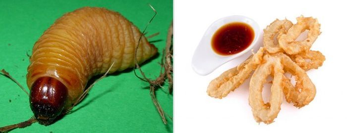 Личинки пальмового жука (36 граммов белка на 100 граммов веса) vs кальмары (18 граммов белка на 100 грамм веса)