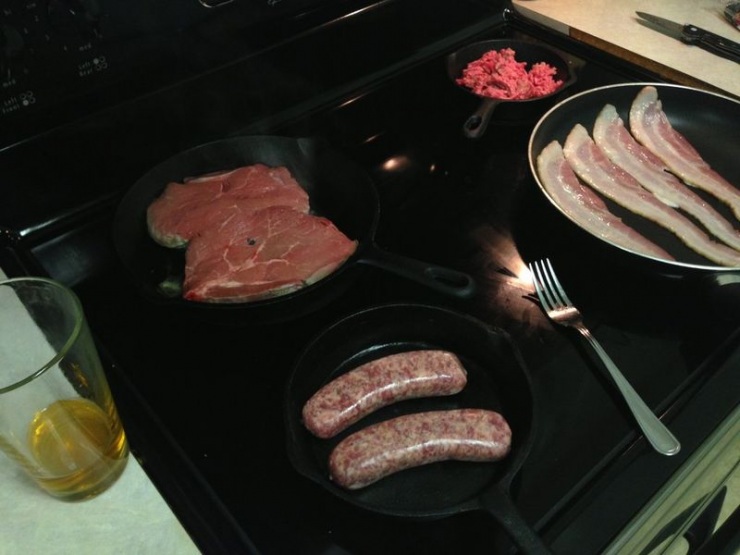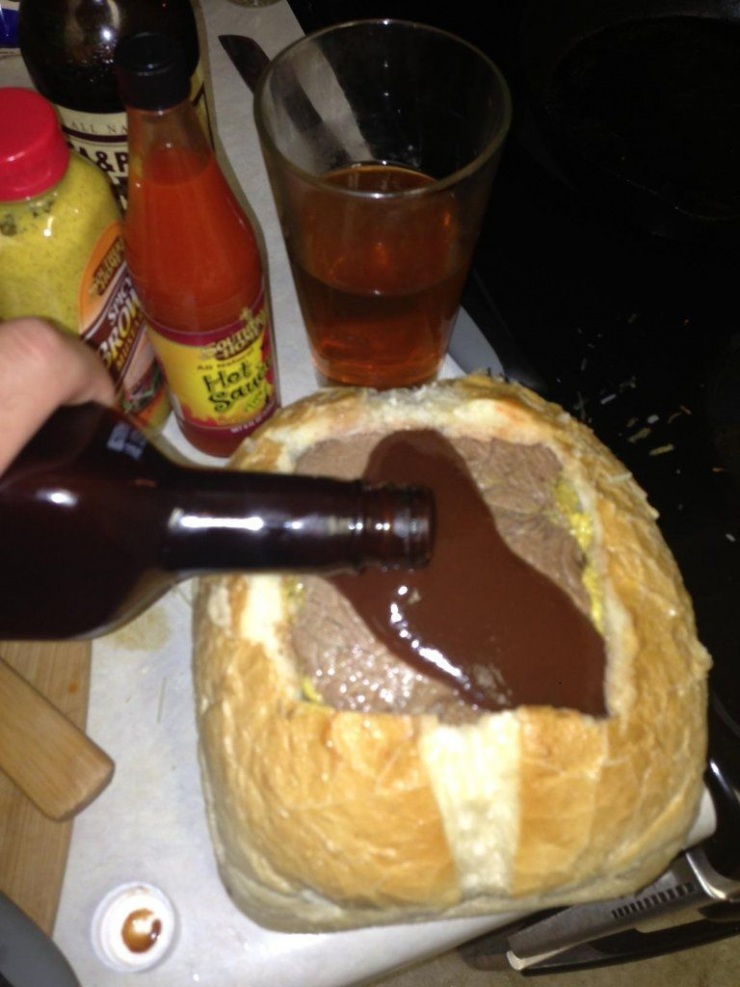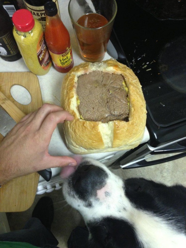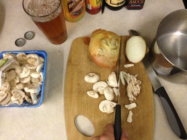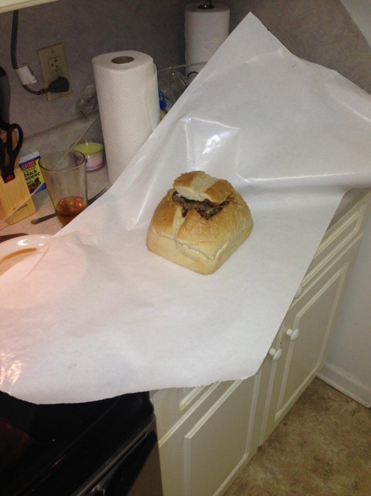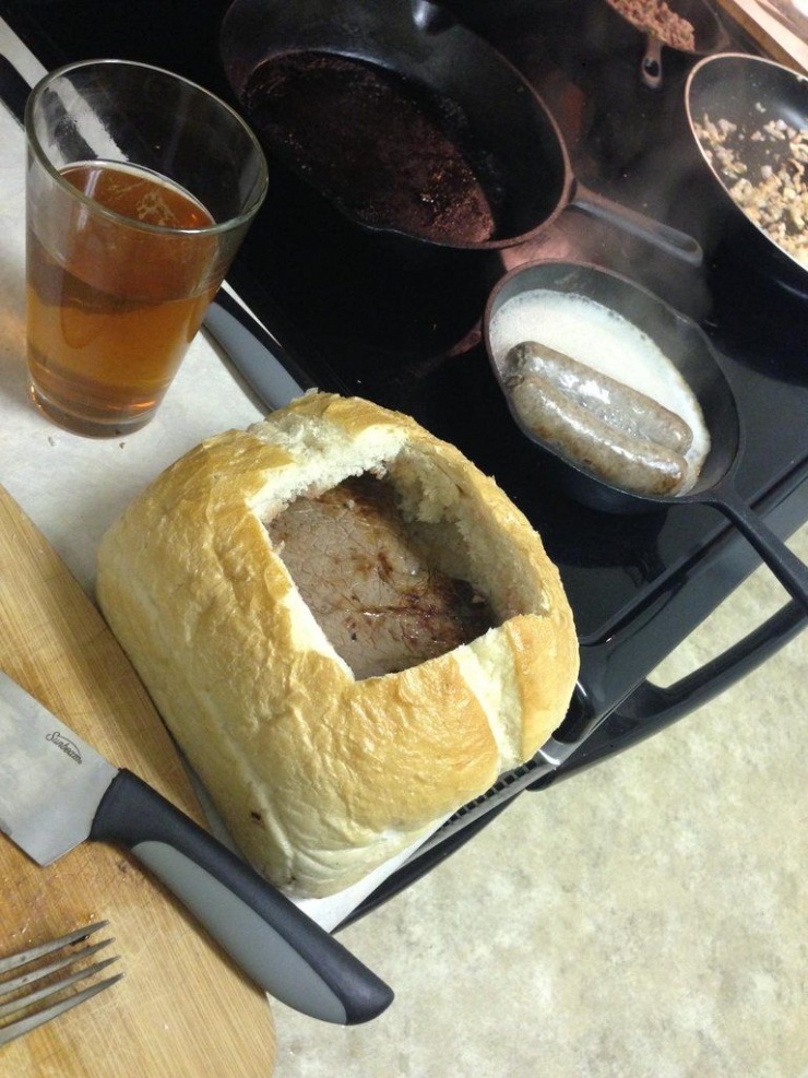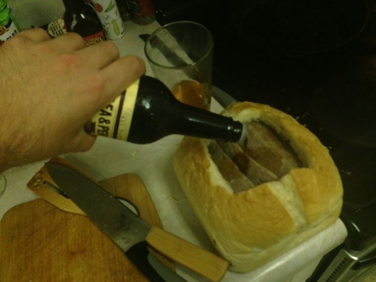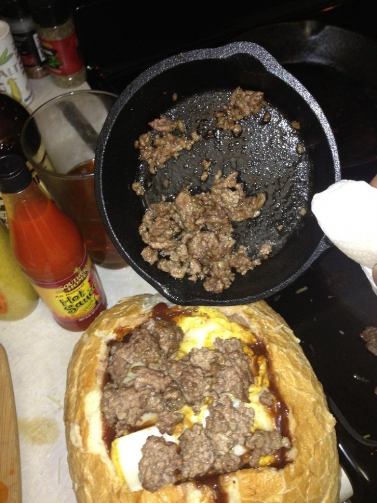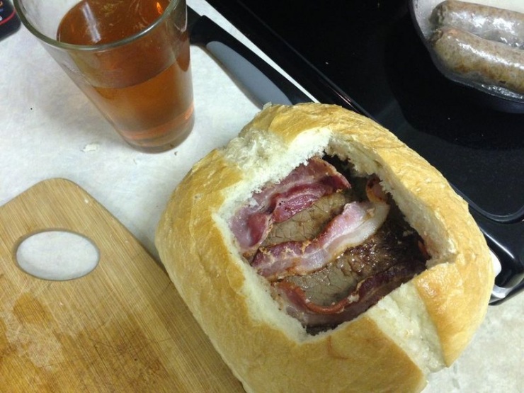 Нарезаем обжаренную колбаску и тоже укладываем в хлеб