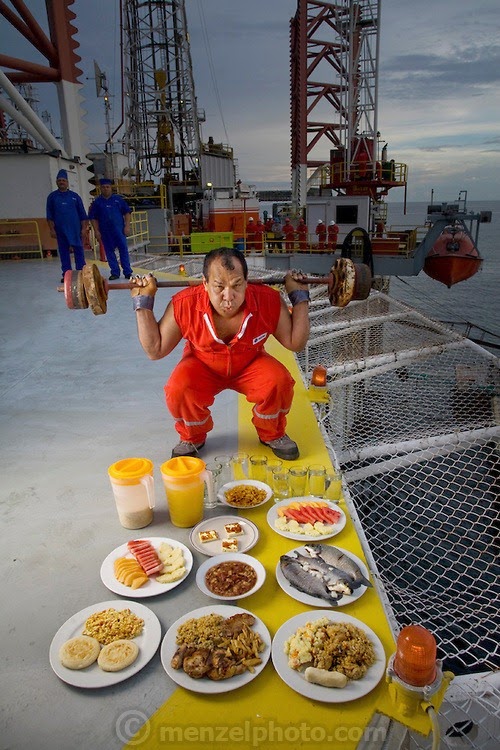 12. Освальдо Гутьеррез, рабочий нефтяной вышки в озере Маракайбо, Венесуэла. Энергетическая ценность его дневного рациона – 6000 ккал. Освальдо 52 года. Рост – 1,7 м. Вес – 99 кг. Гутьеррез работает на платформе по графику 7 через 7. Во время работы он занимается пробежкой на площадке для посадки вертолета, практикует карате, поднимает штанги и подтягивается на канате, чтобы держать себя в форме. В рабочие дни он питается в местной столовой, где выбор блюд варьируется от здоровых до жирных и вредных. Свежевыжатый апельсиновый сок всегда в меню, и Гутьеррез пьет его по три литра в день. Его диета изменилась лет 10 назад, когда он решил сменить жир на здоровье, в отличие от большинства своих коллег.