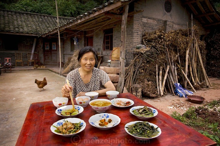 23. Лан Гуихуа – вдова фермера из поселка Ганьцзягоу, Сычуань, Китай. Калорийность ее дневного рациона – 1900 ккал. Ей 68 лет. Рост – 1,6 м. Вес – 54 кг. Домик Лан находится в бамбуковом лесу на холме, у подножия которого похоронен ее муж. А вид со двора открывается на цитрусовые рощи, поля и огороды. Хотя основу ее рациона составляют выращенные ею самой овощи и рис, на заднем фоне на фото можно увидеть кур и чашку с водой, которую Лан использует для ощипывания и потрошения куриных тушек. Обычно мясом Лан потчует гостей. В этом регионе каждая семья сама обеспечивает себя продуктами, поэтому здесь так важны сельскохозяйственные знания и навыки, которые передаются из поколения в поколение.