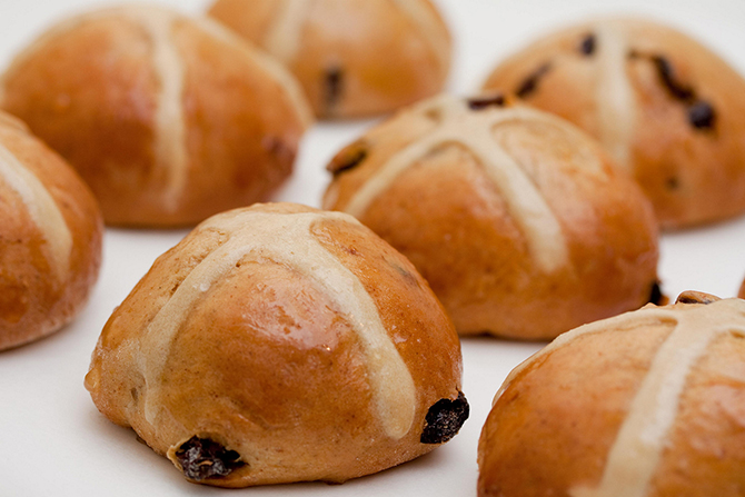 Пасхальные булочки под названием Hot cross bun. Великобритания, Ирландия, Австралия, Новая Зеландия, Канада и США