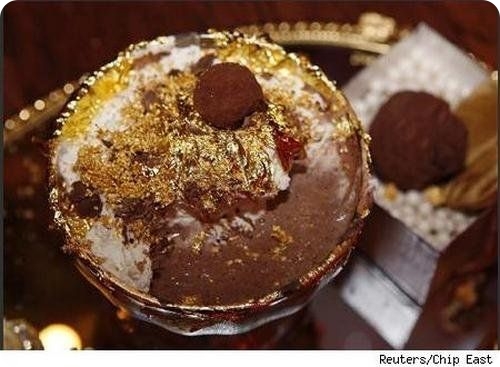 Сандэ «Frrozen Haute Chocolate» Десерт готовится из 5 граммов съедобного золота (23 карат) и подается в высоком бокале на ножке, который изнутри покрыт слоем съедобного золота. Сандэ сверху украшен взбитыми сливками, покрытыми тончайшим слоем съедобного золота, поверх которого расположено несколько шоколадных конфет сорта «трюфель» La Madeline au Truffle стоимостью 250 долларов США каждая или около 5000 долларов США за 1 кг.