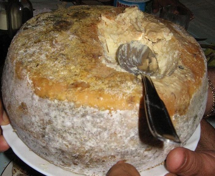 Его готовят, выдерживая дольше обычной стадии ферментации, дожидаются пока сыр не станет подгнивать и запускают личинок специальной сырной мухи.