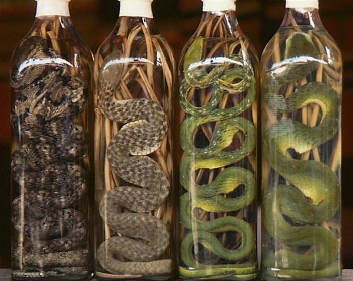 Змеиное вино встречается преимущественно в Азии и готовится погружением целой змеи в рисовое вино. Считается, что этот напиток обладает целебными свойствами и благотворно влияет практически на всё – начиная от выпадения волос до половой потенции.