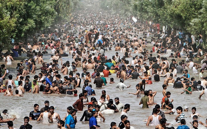 Лахор, Пакистан, 17 июня 2012. Температура +44. Приходится залезать в канал, чтобы хоть немного охладиться.