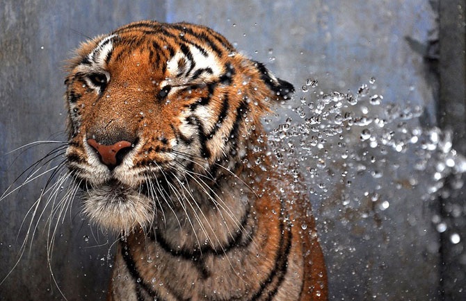 В столице индийского штата Джаркханд, городе Ранчи +40 градусов Цельсия, 30 мая 2012. В зоопарке охлаждают струей воды уважаемого жителя — бенгальского тигра.