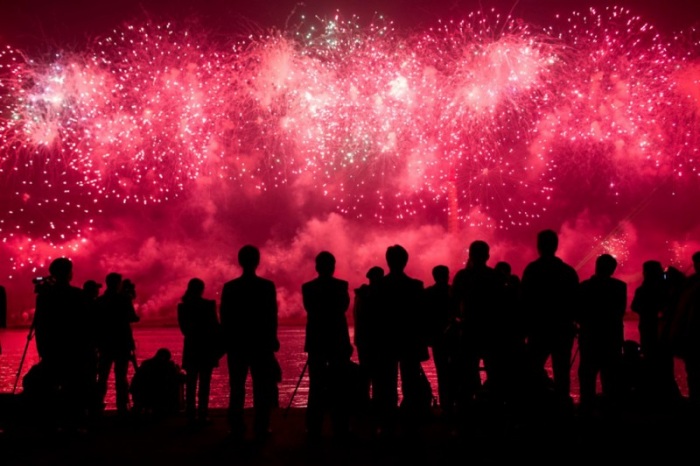 16. Люди смотрят фейерверк в честь 100-летия со дня рождения основателя Северной Кореи Ким Ир Сена в Пхеньяне. (Ed Jones/Getty Images)
