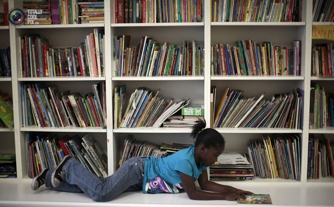 Бездомная девочка читает книгу в школе «School on Wheels» в Лос-Анджелесе, США.