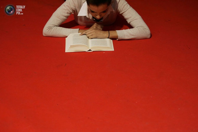 Женщина читает, сидя на стуле, прикреплённом к фасаду здания в Бордо, Франция. Немецкая художница Энджи Хисл (Angie Hiesl) придумала это представление, чтобы прорекламировать книжную ярмарку в Бордо.