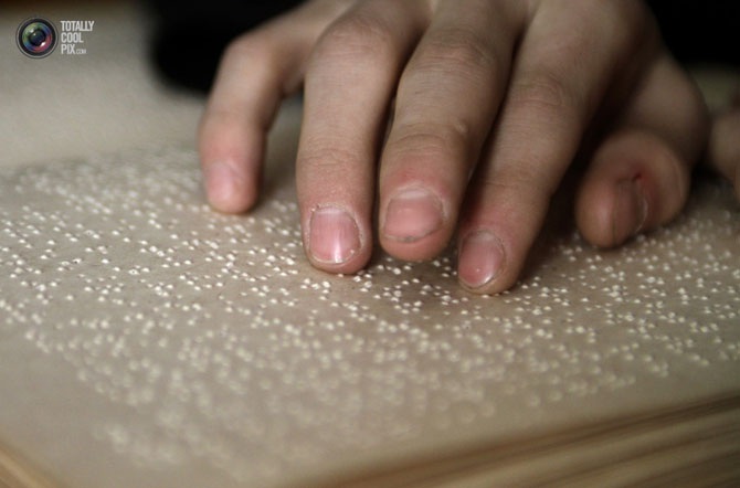 Слепой мальчик читает книгу шрифтом Брайля в школе в Тбилиси, Грузия.