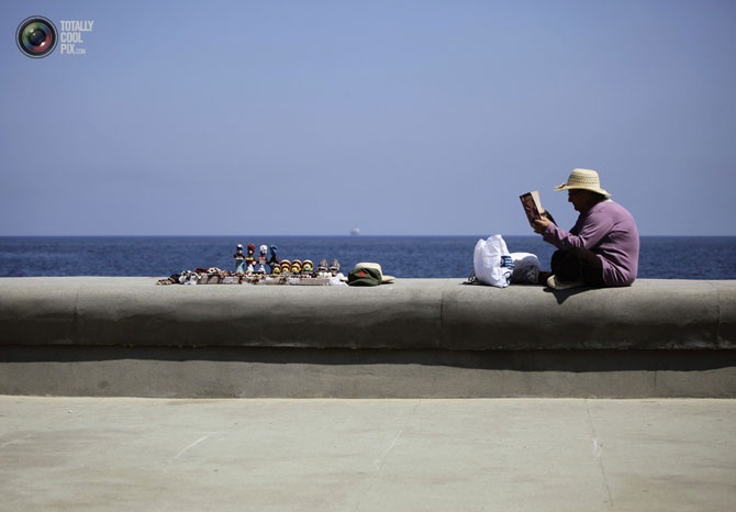 Женщина, которая продаёт сувениры на набережной Малекон в Гаване, Куба, читает книгу в ожидании покупателей.