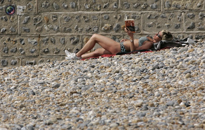 Женщина загорает и читает книгу на пляже в Брайтоне, Англия.
