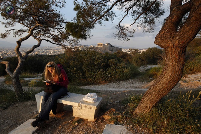 Женщина читает книгу на холме напротив Афинского Акрополя, Греция.