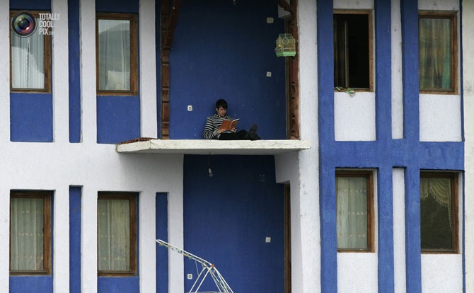Мальчик читает книгу на балконе в городе Митровица на севере Косово.