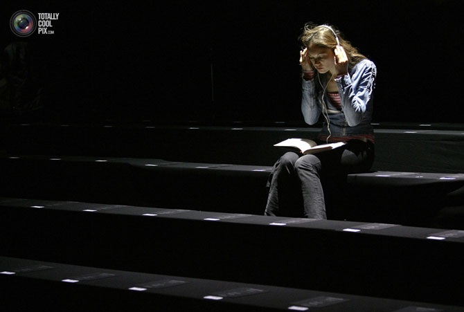 Женщина читает книгу перед началом показа коллекции женской одежды Roberto Cavalli Fall/Winter 2010/11 на Неделе моды в Милане.