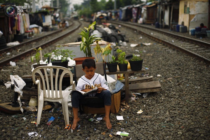 Ребёнок читает книгу в районе трущоб в Джакарте, Индонезия.