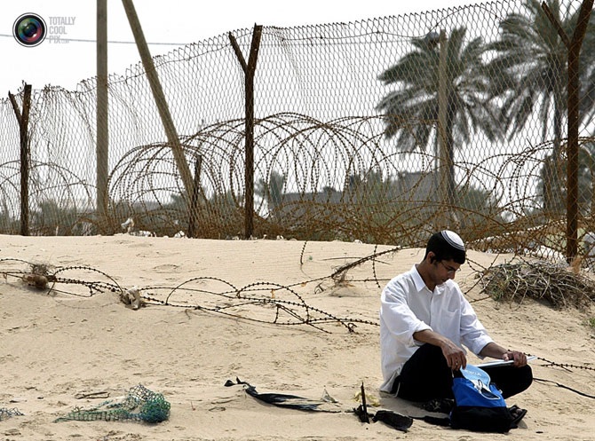 Еврейский поселенец читает книгу перед митингом в квартале Gush Katif в секторе Газа.