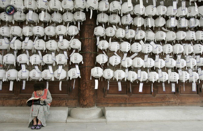 Буддистка читает священную книгу возле зала проповедей в Сеуле, Южная Корея.