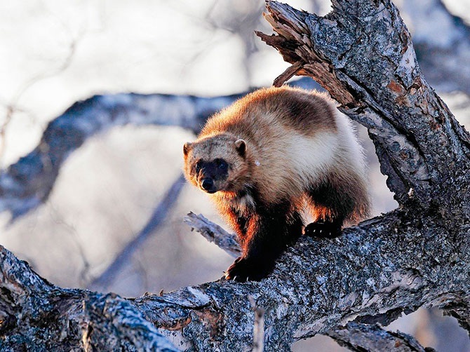 Росомаха, Камчатка. Росомаха производит впечатление существа неповоротливого, однако она необычайно ловко лазает по деревьям.