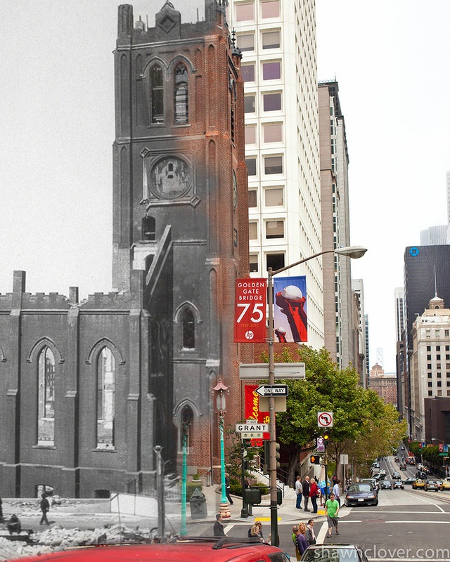 Отправной точкой проекта стали черно-белые фотографии, сделанные после землетрясения в 1906 году. Фотограф отыскал места со снимков и запечатлел панорамы в той же перспективе. Между разными историческими периодами Шон открыл временной портал, наложив на сцены из прошлого панорамы современного города.