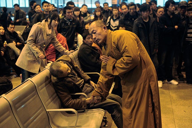 Монах рядом с пожилым человеком, который внезапно умер, ожидая поезда в Шаньси Тайюань, Китай.