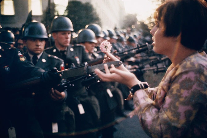 Молодой пацифист Джейн Роуз Кэсмир, с цветком на штыках охранников в Пентагоне.