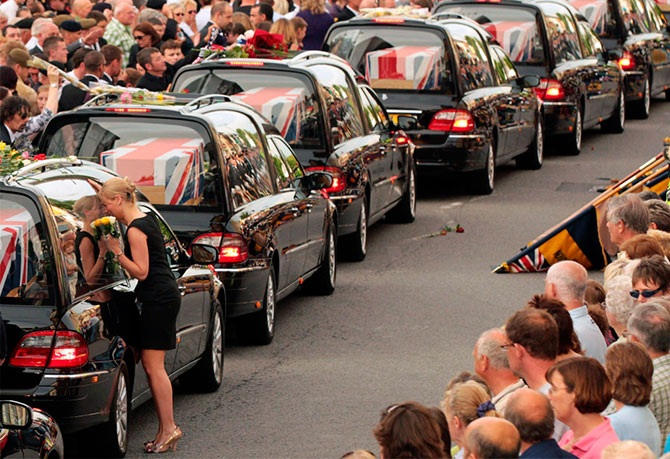 Хелен Фишер целует катафалк, перевозящий тело ее 20-летнего кузена, рядового Дугласа Халлидея.