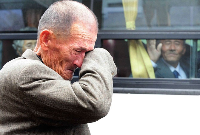 Человек из Северной Кореи (справа) машет рукой из автобуса плачущему южнокорейцу после семейной встречи у горы Кумганг, 31 октября 2010 года.Их разлучила война 1950-53 годов.