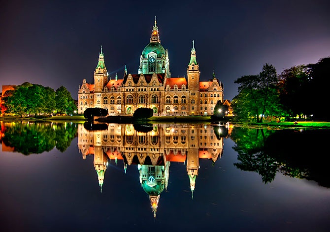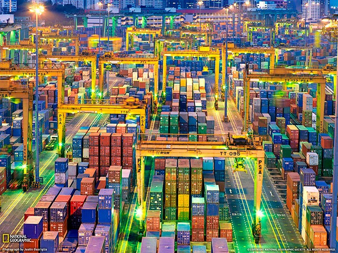 Один из самых загруженных портов в мире при вечернем освещении выглядит весьма разноцветно.