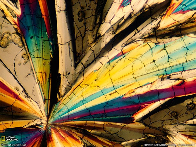 Кристаллы сахара под микроскопом напоминают витраж, поскольку каждый кристаллик отражает свет под своим углом.