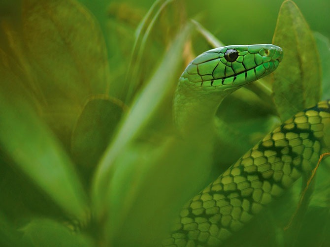 Это очень изящная, неядовитая змея. Спина окрашена в яркий, изумрудно-травянисто-зелёный цвет. Интересно, что на снимке кажется змея агрессивна, на самом желе уж просто зевает. Змеи зевают после обеда, чтобы поставить челюсть на место и восстановить дыхание.
