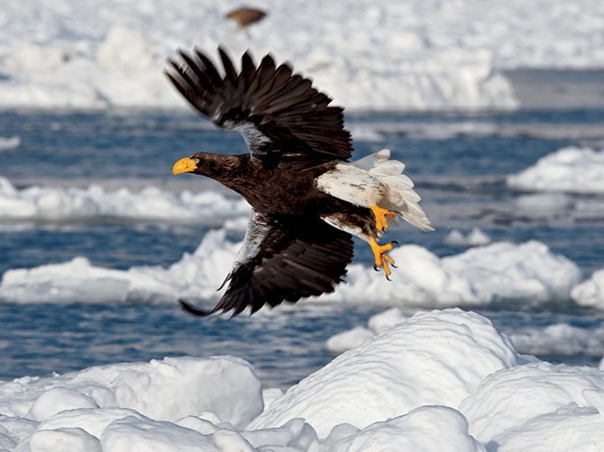 У берегов полуострова Сиретоко белоплечий орлан зорким глазом высматривает между льдинами блестящую сельдь.