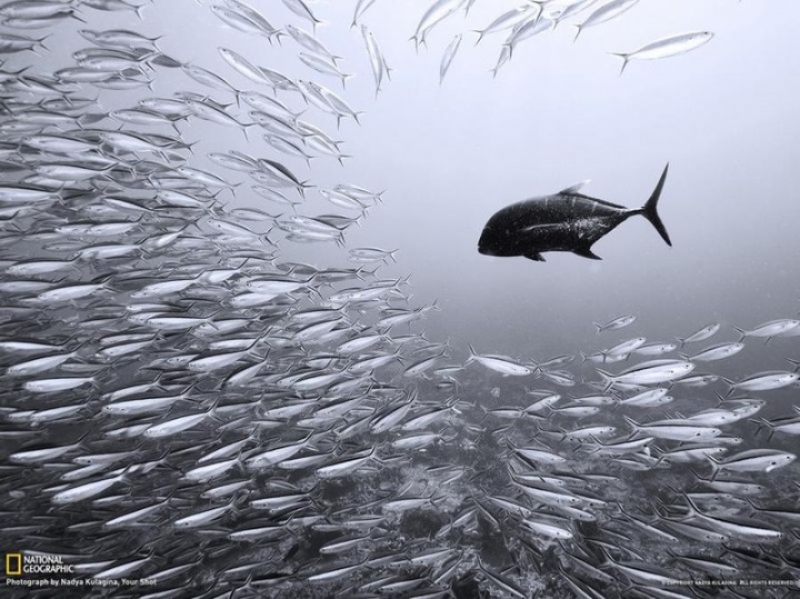 15. Морской хищник спокойно плавает среди стаи сардин, давая рыбам привыкнуть к своему присутствию. Через несколько минут он неожиданно нападёт на них. Nadya Kulagina.