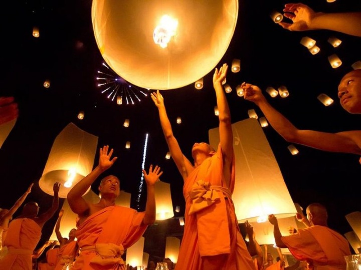 21. Буддийские монахи- паломники запускают в небо фонарики у храма Сонг Пе Нонг. Paramit Supadulchai.