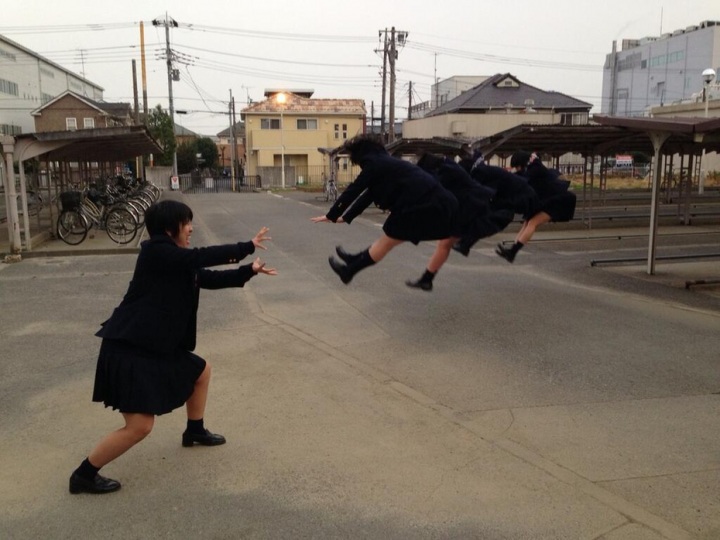 Сейчас в Японии все популярнее один фототренд: выпуск невидимой суперэнергии, которая буквально раскидывает одноклассников по всем углам. Этот тренд придумали школьницы, которые назвали его “Маканкосаппо” или “Hadokening” – в честь особой атаки из популярной манги и аниме «Жемчуг Дракона».