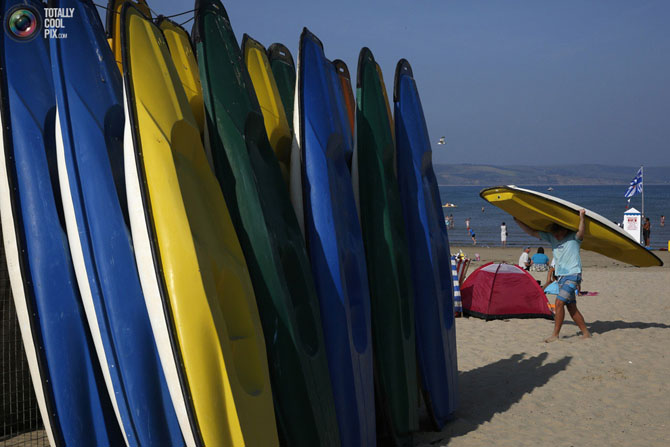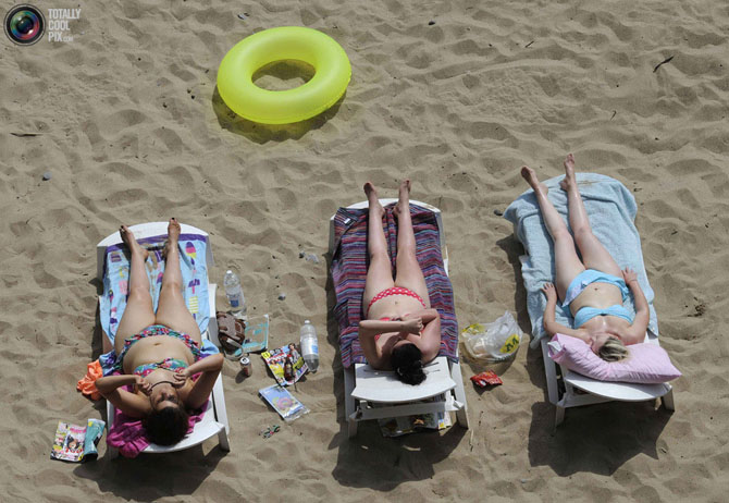 Люди загорают на пляже в Борнмуте на юге Англии.