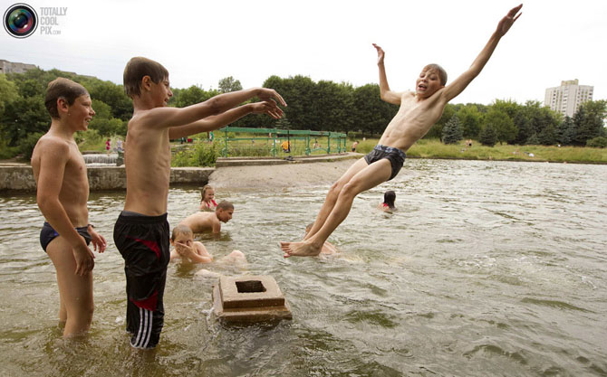 Дети купаются в канале в жаркий день в Минске, Беларусь.