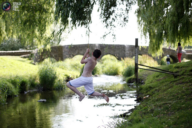 Мальчик играет над ручьём в жаркий день в Ансти, Великобритания.
