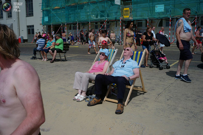 Люди прячутся от солнца под причалом на пляже в Борнмуте на юге Англии.