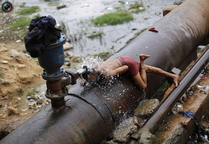 Мужчина моется водой из неисправного водопровода в жаркий день в Нью-Дели, Индия.