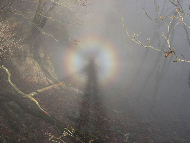 Это явление наблюдается туманным утром. Радужный солнечный диск появляется напротив солнца, в результате отражения солнечных лучей от капелек воды тумана. Любопытная треугольная тень, разрывающая радужный диск отражённых солнечных лучей – проекция верхней поверхности облаков.
