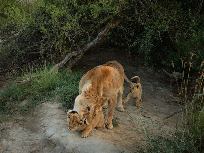Львица присматривает за детенышами. В первые несколько недель новорожденные еще слишком малы, чтобы участвовать в общей возне с подросшими львятами прайда, и слишком беззащитны перед хищниками, так что мать прячет их в укромном логове. Но эти малыши скоро уже присоединятся к старшим.