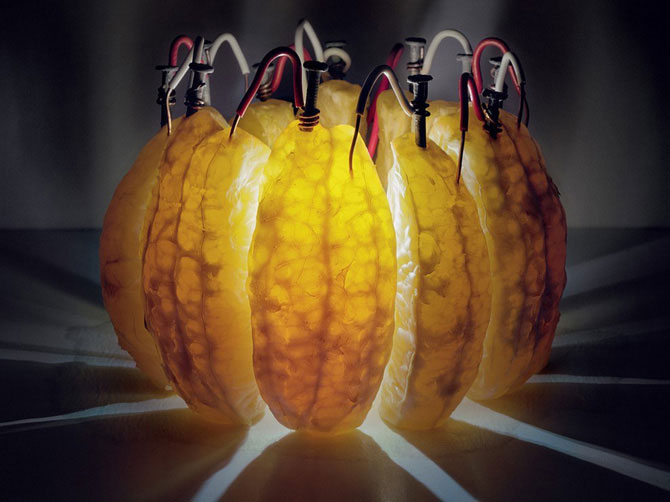 Дольки одного апельсина вырабатывают достаточно электричества – 3,5 вольта – для питания светодиода. Лимонная кислота, содержащаяся в составе этого плода, служит электролитом, проводя электроны от оцинкованных гвоздей к медной проволоке. Снимок сделан с выдержкой 14 часов.