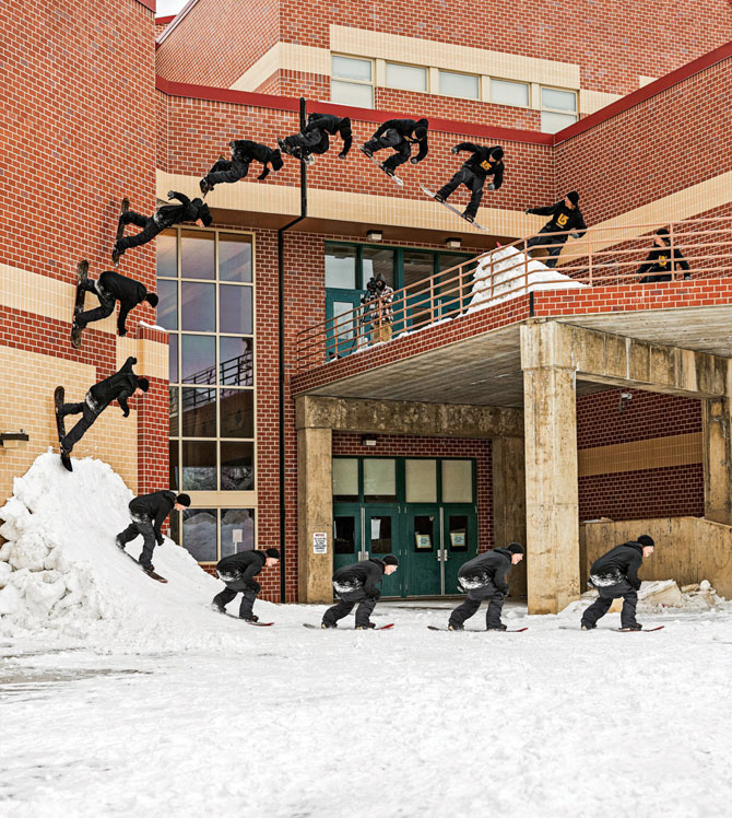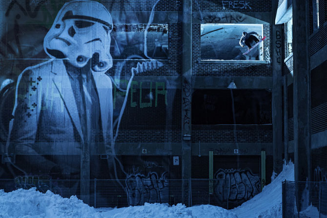 Этот ракурс фотограф Лоренс Холдер заметил летом и очень хотел сделать фотографию прыжка на сноуборде во время сильного снегопада. Для воплощения этой идеи в жизнь Лоренс поставил за тарелкой два больших стробоскопа и направил их вверх, чтобы создать «стену» из падающего снега во время того, как Ксавьер делал свой прыжок.